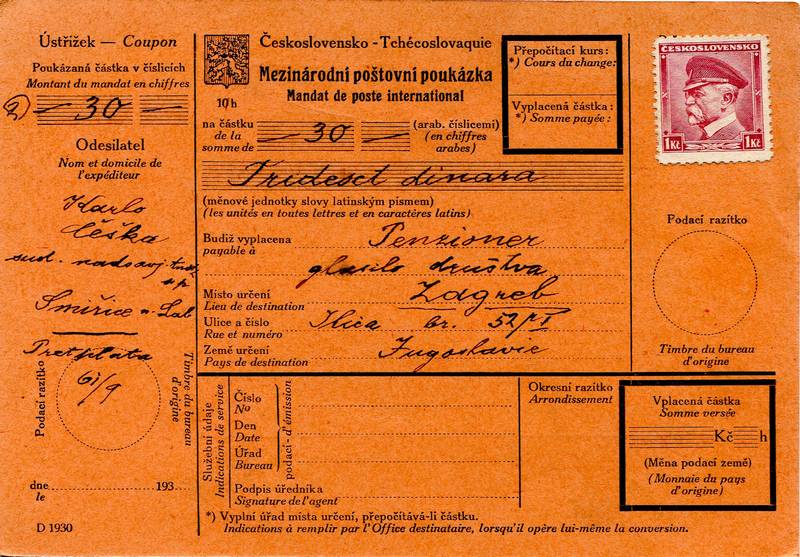 Karel Češka chtěl odeslat 30 dinárů do Záhřebu v Jugoslávii.