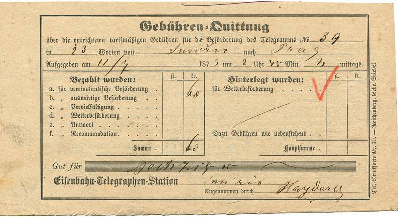 Potvrzení o podání telegramu. Razítko C. K. telegrafní stanice Smiřice.