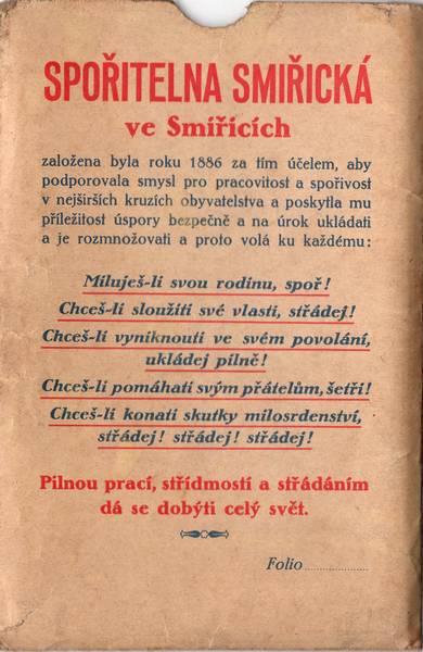 SPOŘITELNA SMIŘICKÁ přijímá a vyplácí vklady toliko ve všední dny od 8 hod. ráno do 3 hod. odpoledne.