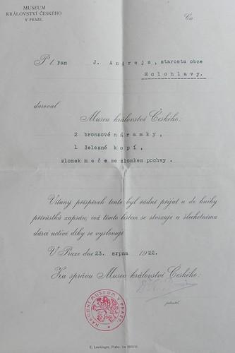 Vlevo: Dopis potvrzující archeologické nálezy adresovaný starostovi Holohlav Rudolfu Andrýsovi ( chybné oslovení )
