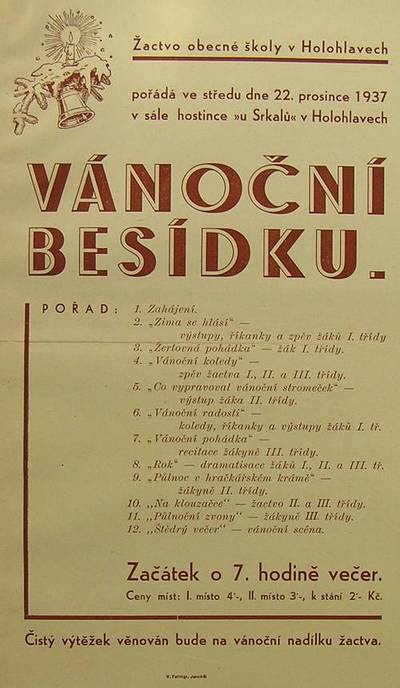 Péči místního odboru Národní Jednoty Severočeské zde bylo o Śtědrém dnu odpoledne poděleno veškeré žactvo z obce psacími a kreslícími potřebami v ceně as 400 K a patnácti