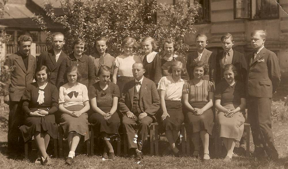 Vpředu sedí zleva děti: Hana Srkalová vdaná Fejglová *1926 a Zdena Sehnoutková vdaná Melgrová *1932.