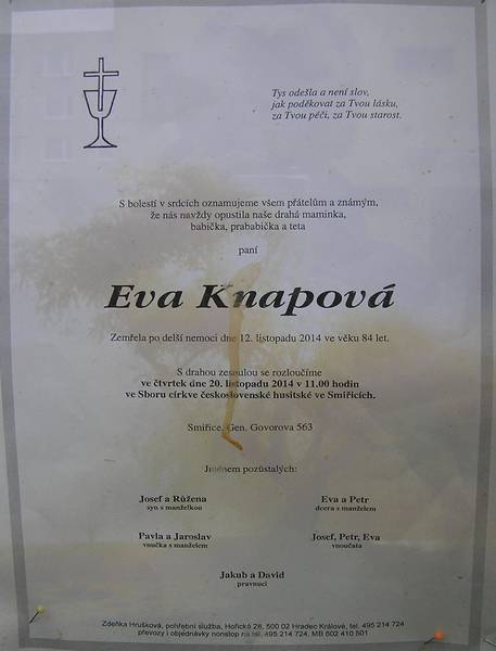 Paní Eva Knapová zemřela po delší nemoci dne 12. listopadu 2014 ve věku 84 let.