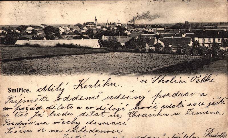 Nakl. Adolf Mahler. Smiřice. Na razítku je datum 1910.