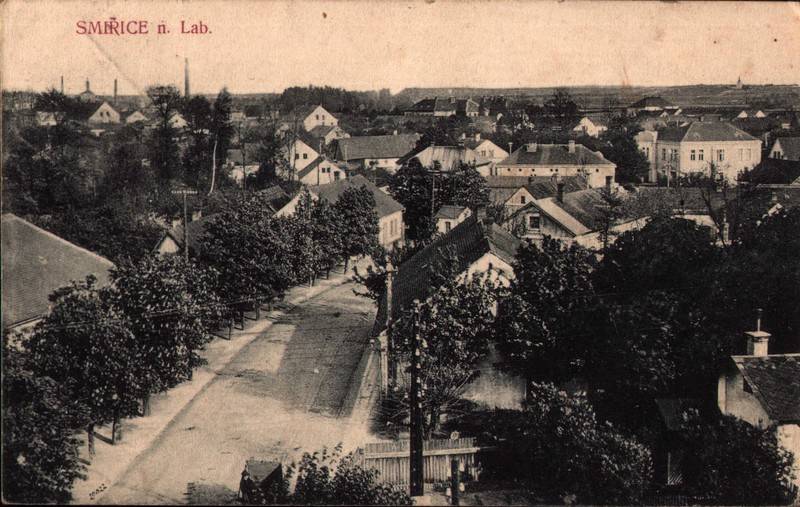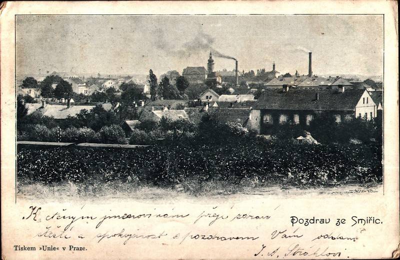 Nákl. Fr. Špaček Smiřice. Na pohledu je připsané datum 15.5.1909
