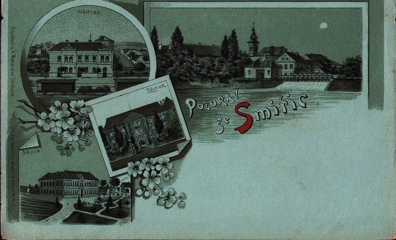 Pozdrav ze Smiřic. Nákladem: Ed. Veselovského. Dopisnice odeslaná v roce 1903.