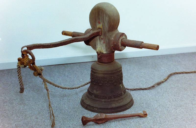 Pan Václav Klimeš se zvonem – umíráčkem před před předáním restaurátorovi, panu Manouškovi.