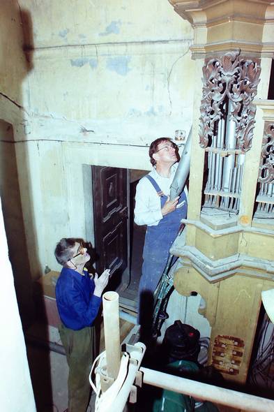 Kaple – zástupce investora, pan Václav Klimeš při vyjímání starších, avšak nepůvodních píšťal z varhan ze začátku 19. stol.,