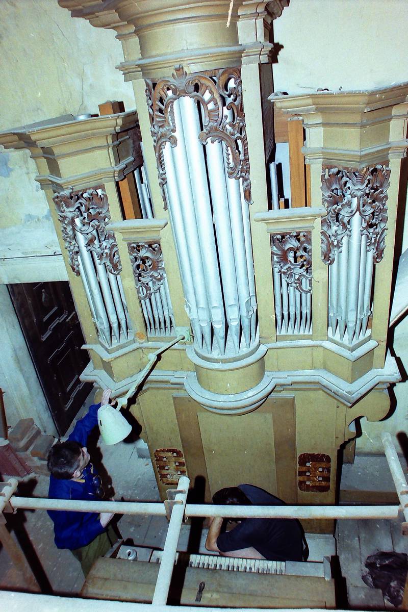 Kaple – odborný pracovník památkového ústavu při vyjímání píšťal ze vzdušnice varhan před následnou rekonstrukcí.