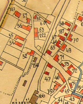 Polohorys vpravo nahoře je z plánu: Nákres na postavení nové kulny pana Františka Horáka čís. pop. 45 ve Smiřicích, rýsoval jej 10.9.1880 Kottland. Vpravo svisle vedouci Ulice k nádraží je vidět na obrázku nahoře.