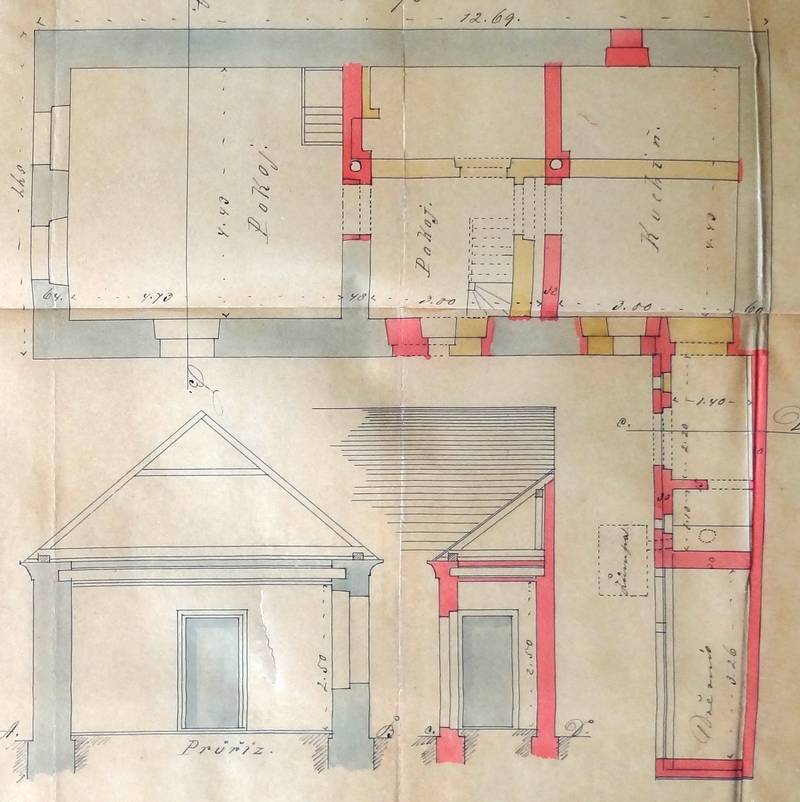 Jelikož na místě starého sešlého prkenného dřevníku provede se přístavba jak z nákresu viděti z tvrdého staviva a tvrdou krytbou přikryje, a co vnitřní úpravy se týče, vše pohodlně se zařídí, vzláštním komínem opatří a vůbec vše do pořádku uvede nemá podepsaný ničehož více k připomenutí.