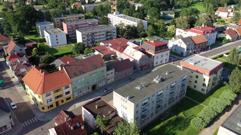 Vpravo dole je umístěna lékárna. Nahoře ordinují dva zubaři (MUDr. Jiří Ševčík a MUDr. Jiří Šilhan), některé dny gynekologie, internista MUDr. Luboš Slezák, oční optika. Stav roku 2019.