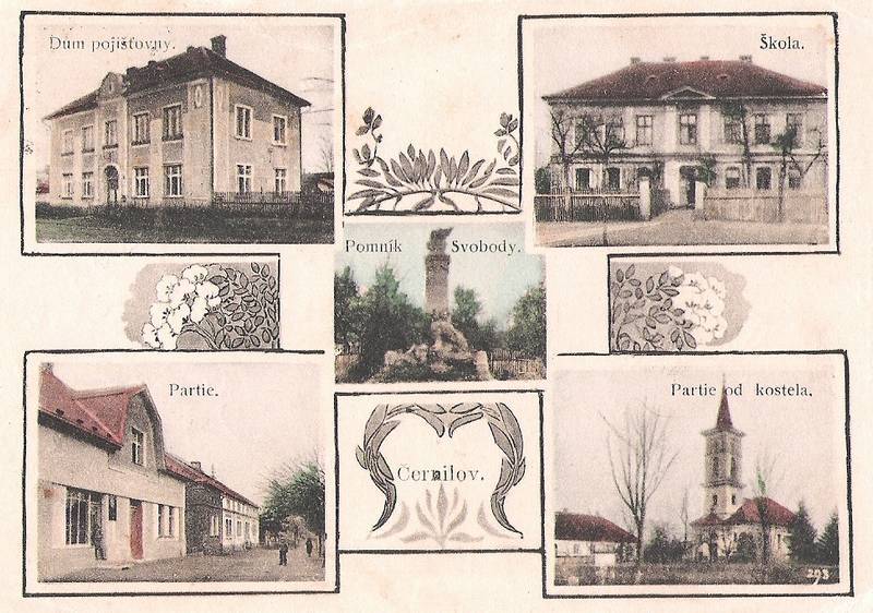Sokolovna (sokolovna čp. 123 a část Jandíkova hostince čp. 122), Kostel českobratrský (pův. evangelický reformovaný), Partie od školy (zleva katolická fara, škola, část statku Václava Voltra čp. 269 a v popředí hostinec Anny Jindrové čp. 122), Katolický kostel, Pomník Svobody (pomník padlých). Pohlednice z ateliéru J. Rezka, Praha, Václavské nám. 59, vydána nákladem Růženy Machové. Odeslána ve dvacátých letech 20. století. Fotoarchiv obce