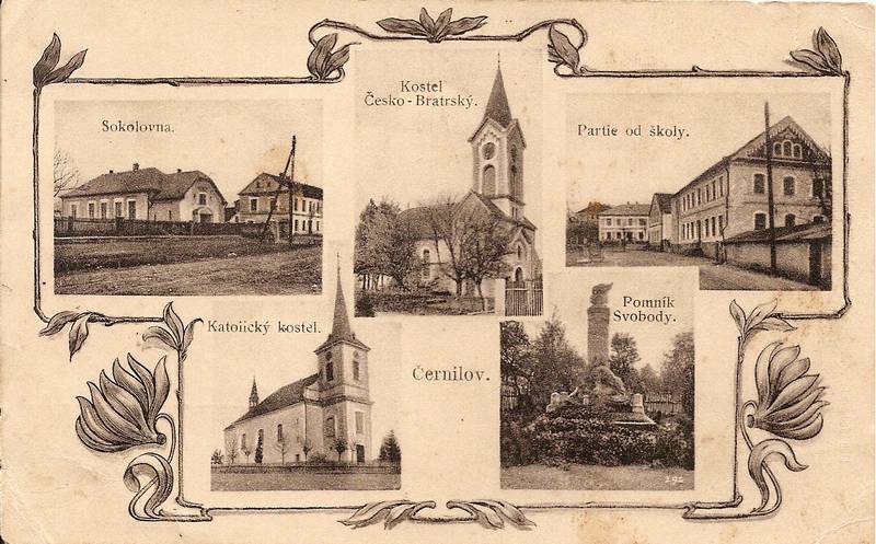 Celkový pohled na Černilov (v pozadí katolický kostel), pohledy vlevo: obchod Josefa Hojného čp. 201 a katolický kostel s farou čp. 1, pohledy vpravo: evangelický augšpurský kostel, evangelický reformovaný kostel. Pohlednici vydána nákladem obchodníka Josefa Hojného, odeslána roku 1911. Fotoarchiv Martina Kareše