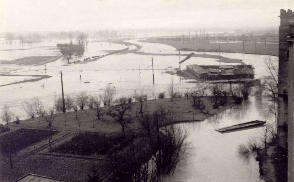 Velká voda byla i při regulaci. Fotografováno z budovy přádelny bývalé firmy Sehnoutka, po znárodnění Tiba.