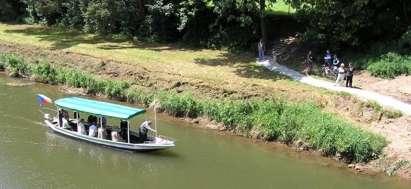 Tyršův most je už v dohledu. Loď se plaví proti proudu.